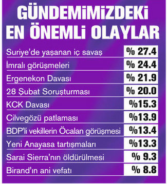 Araştırmada, “Son üç ay içerisinde Türkiye’de gündemi belirleyen en önemli üç olayın hangileri olduğunu düşünüyorsunuz?’’ sorusuna en çok ‘Suriye’de yaşanan iç savaş’ cevabı verildi. Ardından İmralı ve Ergenekon Davası geldi.