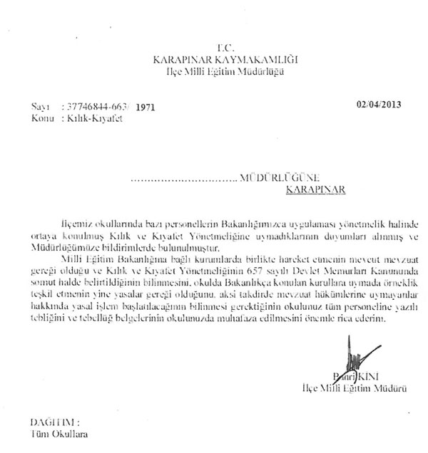 Konya Karapınar İlçe Milli Eğitim Müdürlüğü tüm okullara bir yazı yazarak, kılık kıyafete uymayan personelin uyarılmasını istedi.