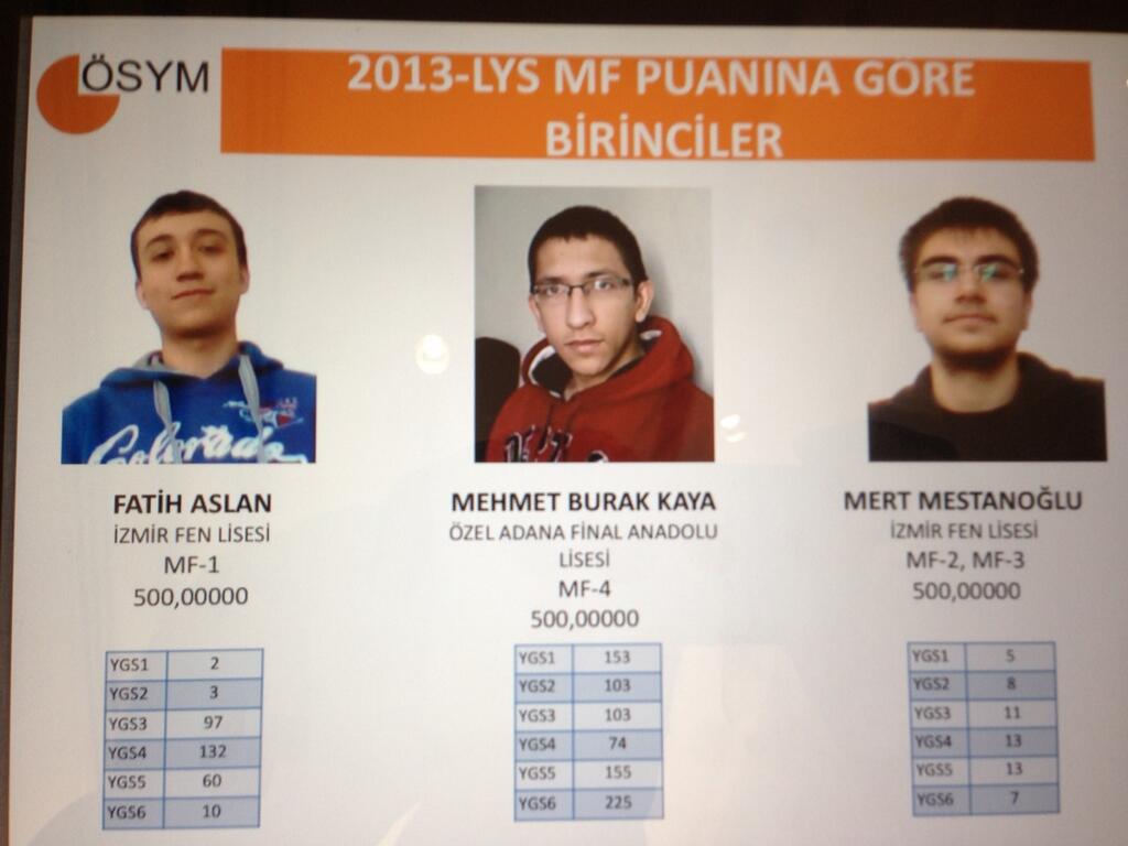 Demir'in verdiği bilgilere göre, MF-1 puan türünde İzmir Fen Lisesi'nden Fatih Aslan, MF-4 puan türünden Özel Adana Final Anadolu Lisesi'nden Mehmet Burak Kaya, MF-2 ve MF-3 puan türlerinde İzmir Fen Lisesi'nden Mert Mestanoğlu 500'er tam puan alarak birinci oldu.